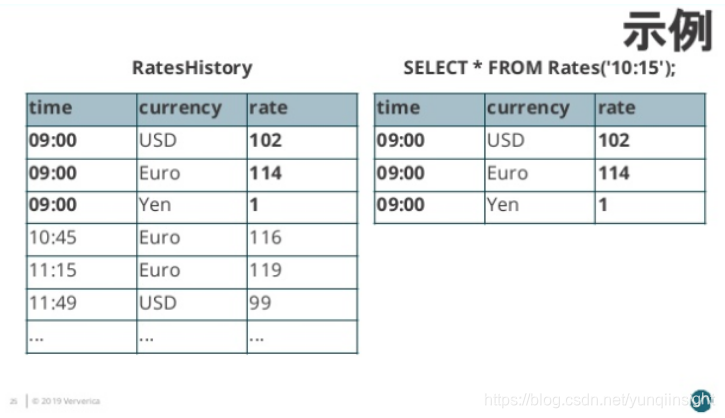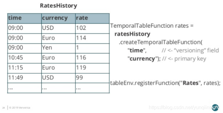 我们将 RatesHistory 注册为一个名为 Rates 的 Temporal Table,设定主键为 currency,版本字段为 time。