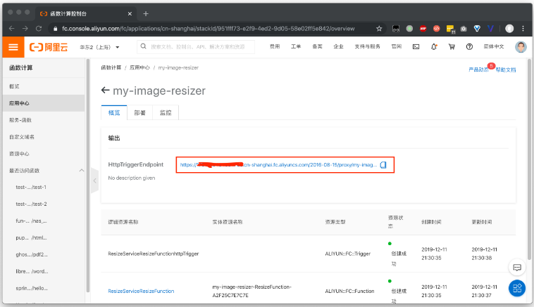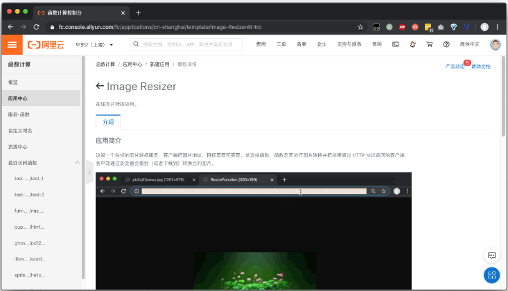 - 打开函数计算 Image Resizer 应用详情页。如果您尚未开通函数计算服务可能需要先,开通服务是免费的,另外函数计算有每月免费额度,试用服务不会产生费用。