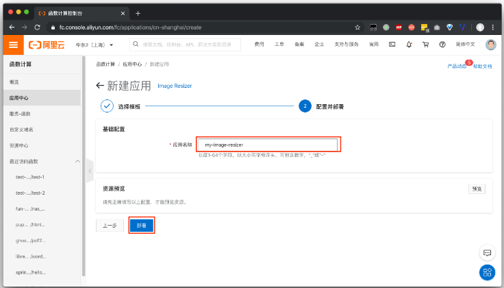 - 填写应用名称:my-image-resizer,然后点击“部署”按钮。