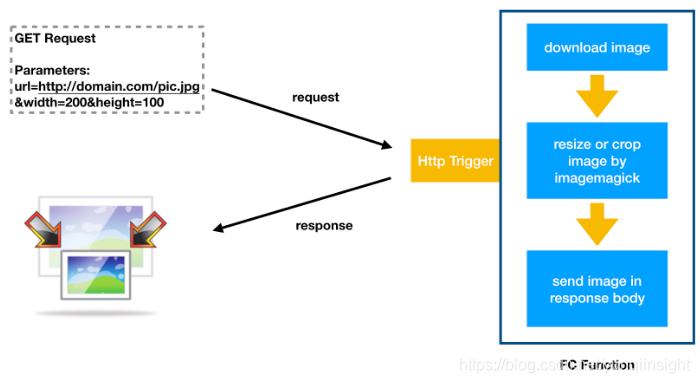 这是一个单函数结合 Http Trigger 的应用。Http Trigger 以 HTTP GET 方法对外暴露服务,客户端传递三个请求参数:url、width 和 height。其中