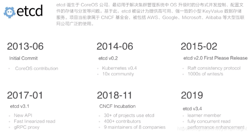 - 第一部分,为大家介绍了 etcd 项目是如何诞生的,以及在 etcd 发展过程中经历的几个重要时刻;
