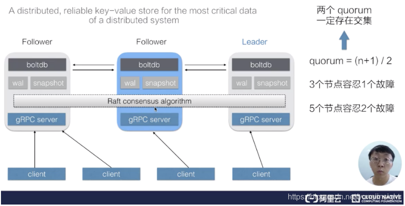 在 etcd 整个架构中,有一个非常关键的概念叫做 quorum,quorum 的定义是 (n+1)/2,也就是说超过集群中半数节点组成的一个团体,在 3 个节点的集群中,etcd 可以容许 1 个节点故障,也就是只要有任何 2 个节点可用,etcd 就可以继续提供服务。同理,在 5 个节点的集群中,只要有任何 3 个节点可用,etcd 就可以继续提供服务,这也是 etcd 集群高可用的关键。