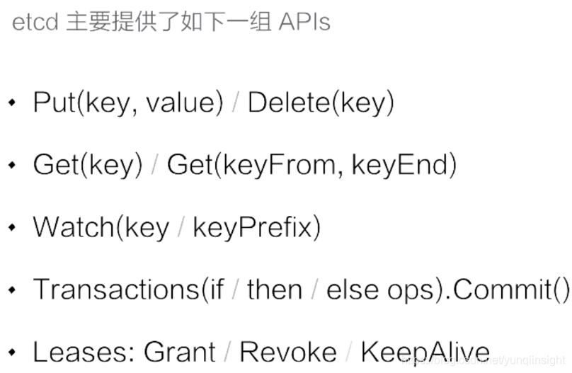 接下来我们看一下 etcd 提供的接口,这里将 etcd 的接口分为了 5 组: