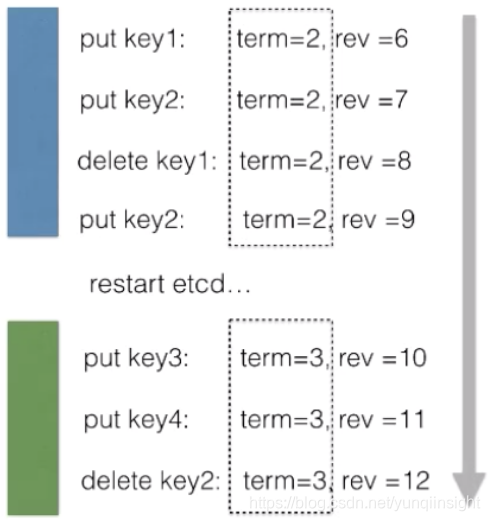 在同一个 Leader 任期之内,我们发现所有的修改操作,其对应的 term 值始终都等于 2,而 revision 则保持单调递增。当重启集群之后,我们会发现所有的修改操作对应的 term 值都变成了 3。在新的 Leader 任期内,所有的 term 值都等于3,且不会发生变化,而对应的 revision 值同样保持单调递增。从一个更大的维度去看,可以发现在 term=2 和 term=3 的两个 Leader 任期之间,数据对应的 revision 值依旧保持了全局单调递增。