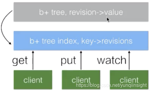 在 etcd 内部还维护着另外一个 btree(蓝色),它管理着 key 到 revision 的映射关系。当客户端使用 key 查询数据时,首先需要经过蓝色的 btree 将 key 转化为对应的 revision,再通过灰色的 btree 查询到对应的数据。