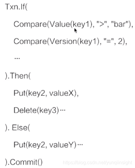 在理解了 mvcc 机制及 watch 机制之后,继续看 etcd 提供的 mini-transactions 机制。etcd 的 transaction 机制比较简单,基本可以理解为一段 if-else 程序,在 if 中可以提供多个操作,如下图所示: