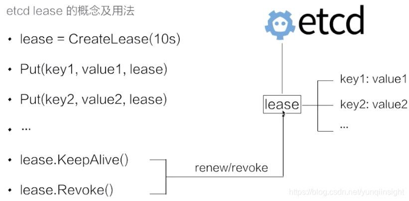 上图示例中的代码示例首先创建了一个 10s 的租约,如果创建租约后不做任何的操作,那么 10s 之后,这个租约就会自动过期。接着将 key1 和 key2 两个 key value 绑定到这个租约之上,这样当租约过期时 etcd 就会自动清理掉 key1 和 key2,使得节点 key1 和 key2 具备了超时自动删除的能力。