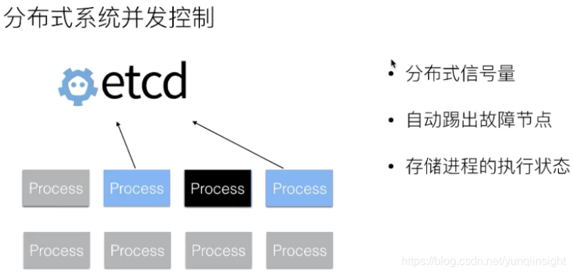 在这个模式中通过 etcd 去实现一个分布式的信号量,并且可以利用 etcd leases 机制来实现自动地剔除掉故障节点。在进程执行过程中,如果进程的运行周期比较长,我们可以将进程运行过程中的一些状态数据存储到 etcd,从而使得当进程故障之后且需要恢复到其他地方时,能够从 etcd 中去恢复一些执行状态,而不需要重新去完成整个的计算逻辑,以此来加速整个任务的执行效率。