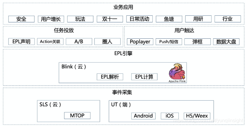 - 第二层是CEP规则计算中心,通过解析DSL生成Blink(Flink)流计算任务,输出满足规则的用户;
