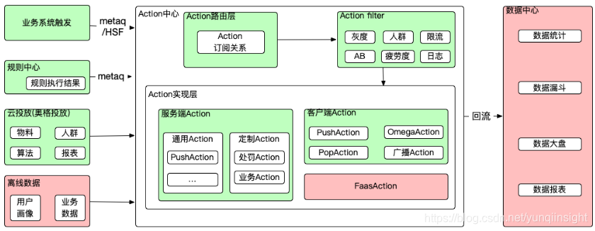 - Action过滤层根据一定策略过滤有效Action列表,过滤策略包括黑/白名单,灰度、人群和疲劳度策略;
