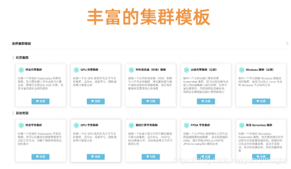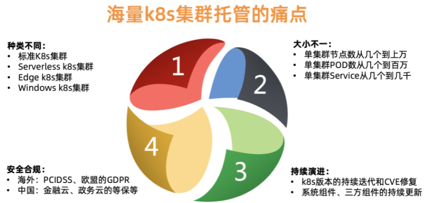 1.集群种类不同:有标准的、无服务器的、AI的、裸金属的、边缘、Windows等k8s集群。不同种类的集群参数、组件和托管要求不一样,并且需要支撑更多面向垂直场景的k8s。