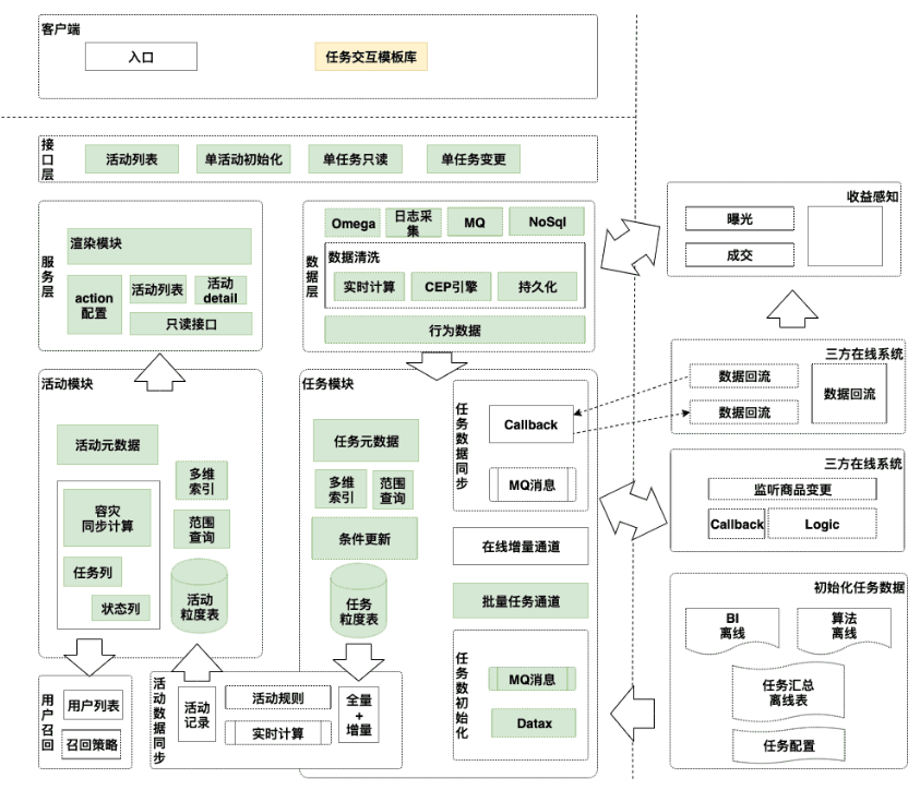 - 容灾计算。虽然同步通道会将任务同步至活动,但是当底层通道出现异常时需要有机制保证可以同步从任务粒度实时计算出活动数据,容灾计算启动时系统整体性能降低。