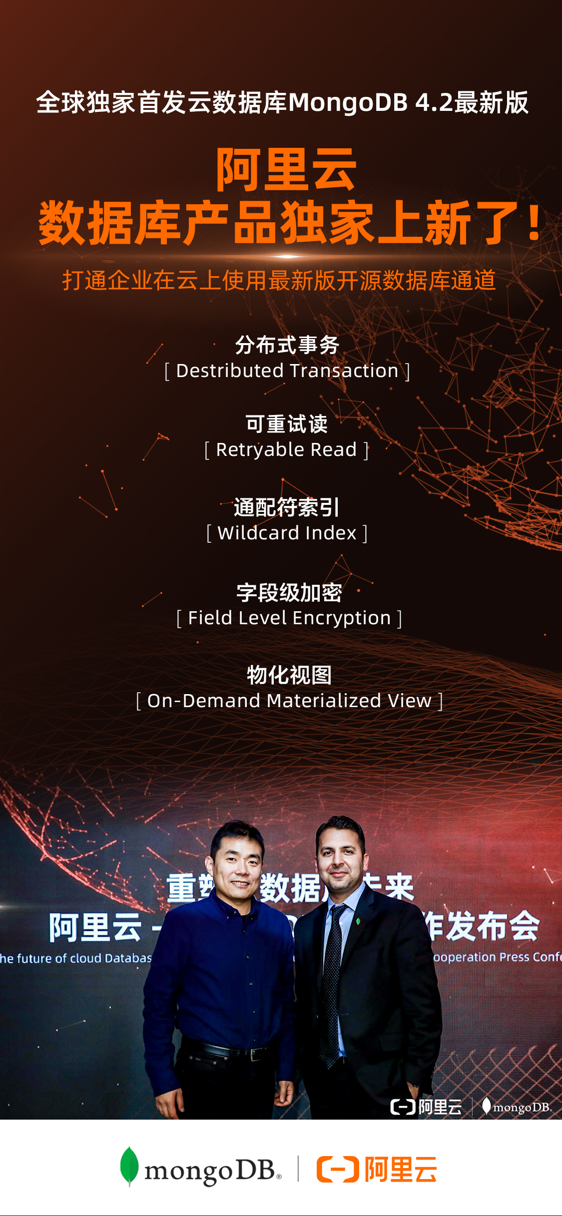今天我们与阿里云强强联手,将帮助客户通过阿里云轻松使用MongoDB-as-a-Service(MongoDB即服务), 助力客户解锁大数据价值,获取云计算红利。”