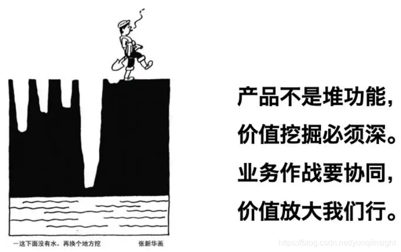 当堆了那么多功能之后,突然发现竞品刚刚推出了一个很火的活动,不是自家刚做过的吗?我们没火但为什么竞品火了?是自家公司的人不行吗?是自家的用户不行吗?其实不是!这里有两个原因,一是在被误解的“小步快跑”交付思想下,许多业务的价值点没有挖透。二是职能团队之间没有形成联动,只做了功能的交付和自运营。试想,一个功能的交付如何打得过一个由产品、运营、PR、市场、渠道等多职能海陆空协同的业务交付呢?价值挖掘不到位,就好比下图的挖井,明知道下面有水源,但不管换多少个地方挖但总挖不出水来。