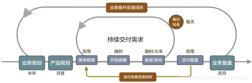 如下图,中间区域是敏捷方法中经典的 Scrum 运作框架(演绎后的叫法略有不同),在此基础上增加业务的反馈闭环,暨在链路前端增加半年一度的业务规划和月度的产品规划,在链路后端也增加了双月一次的业务复盘。业务复盘也可以固定到月,还可以按需不定期的召集,业务复盘中还可附带轻量级的共创,结果会关闭一些项目也会新启动一些新的项目。