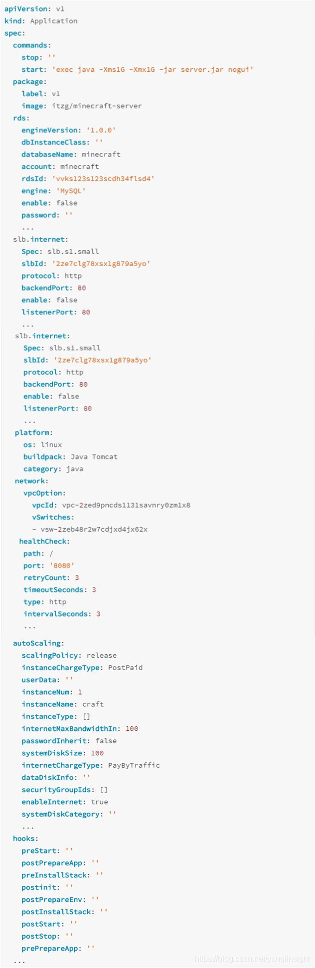 除了基本的 Deployment 描述字段,这种 in-house 应用定义往往还会包含云上资源的声明,比如使用哪种 ECS 套餐、如何续费、使用的是哪种磁盘和规格等等一系列额外的描述。这些资源的定义是一大块,并且上面的例子里我们已经尽量精简了;另一大块就是运维能力的描述,比如自动扩缩容、流量切换、灰度、监控等,涉及到一系列的规则。