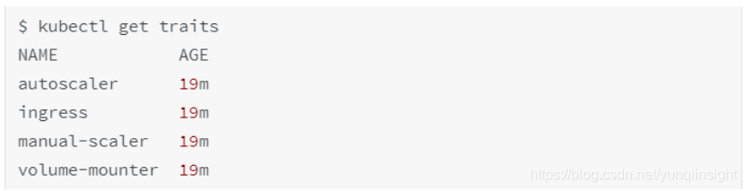 为此,我们设计了一个叫做 Trait 的概念。所谓 Trait,也就是应用的“特征”,其实就是一种运维能力的声明式描述。我们能通过命令行工具发现一个系统里支持哪些 Traits(运维能力)。