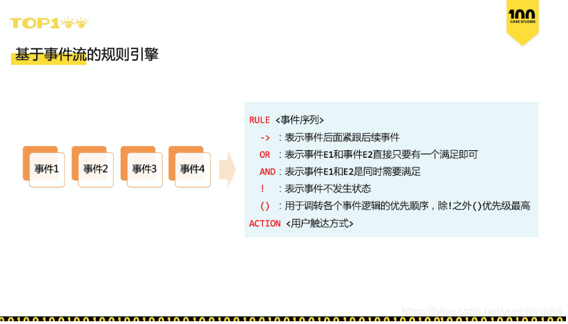 针对这层业务抽象,我们再做了工程化,目的就是为了提升研发效率和运营效率。这样就有了第一个方案——基于事件流的规则引擎,我们认为用户的行为是一串顺序的行为事件流,使用一段简单的事件描述DSL,再结合输入和输出的定义,就可以完整地定义一个规则。