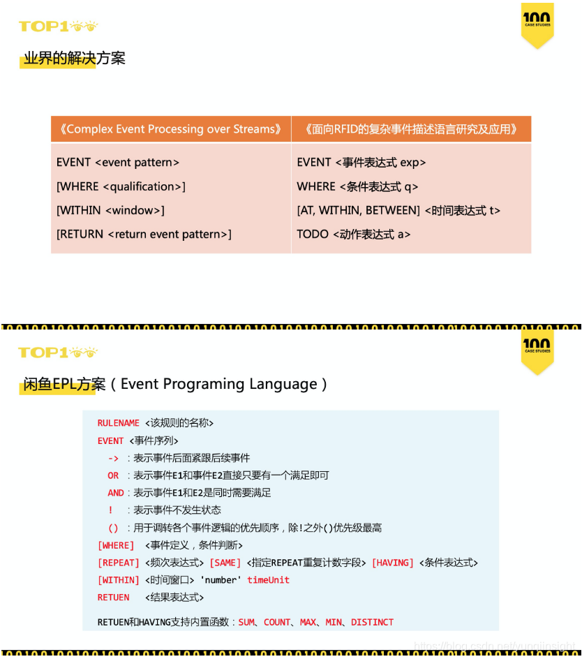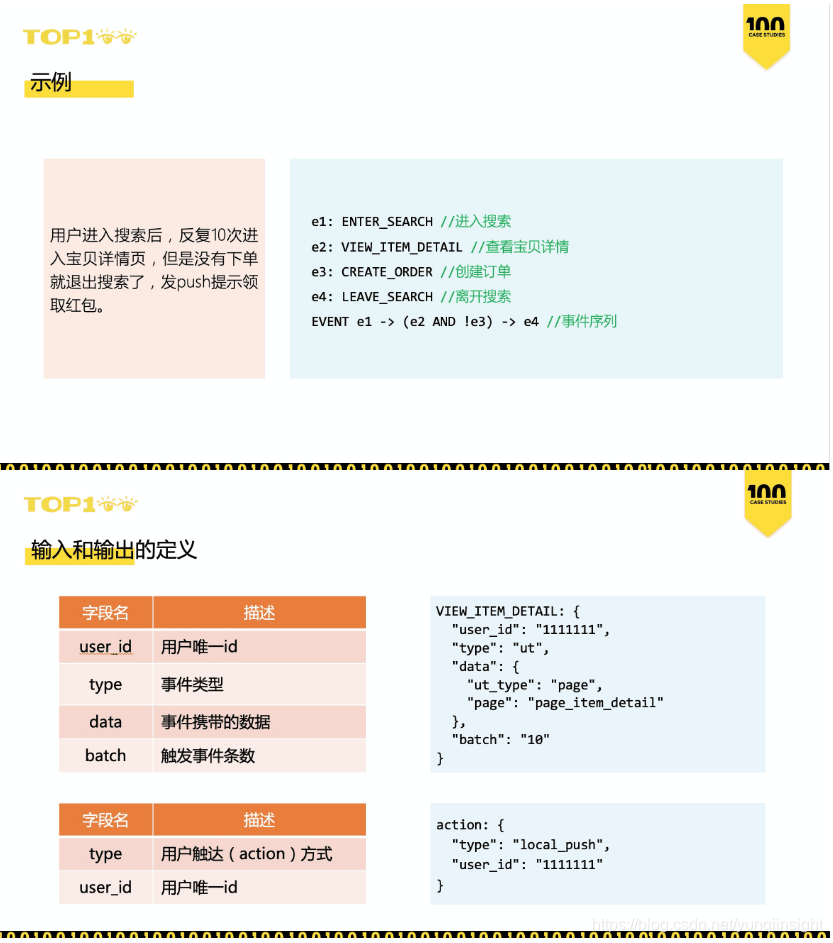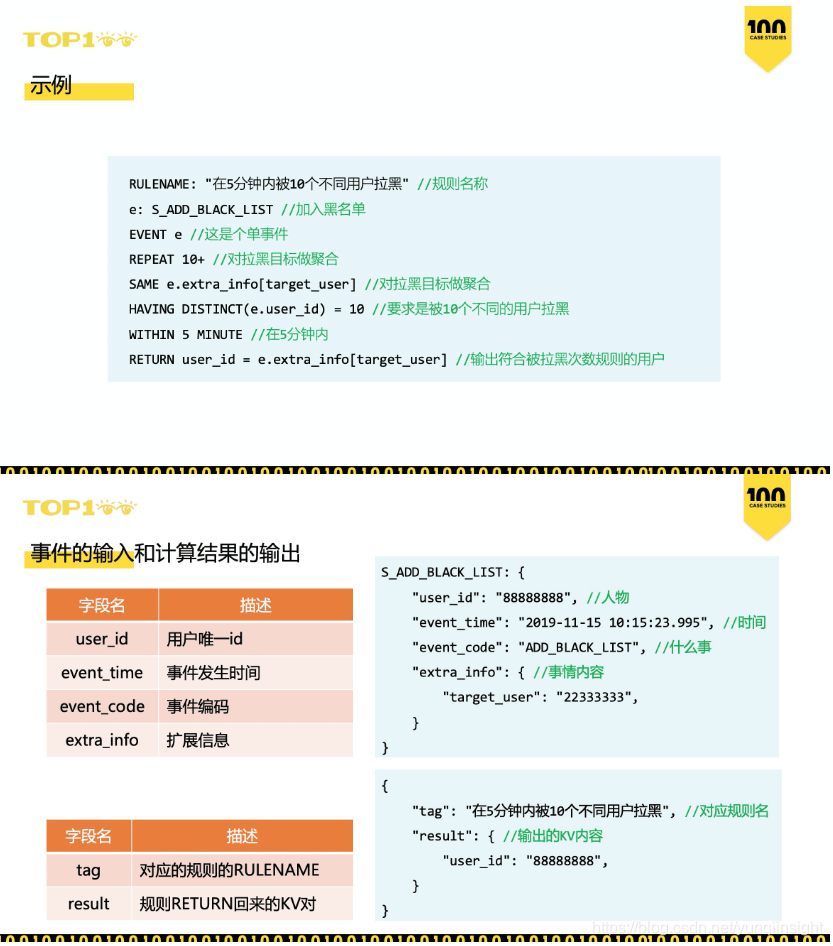 - 增加了时间表达式。通过WITHIN关键字,定义了一个时间窗口。通过HAVING之后跟的DISTINCT等关键字,就可以针对时间窗口内的事件进行聚合计算。使用新的方案,就可以很好地解决上述C2C业务上的规则描述问题。