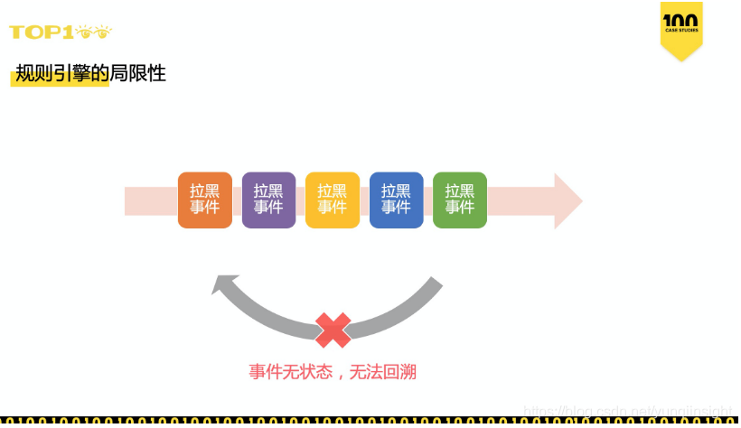 但是将上述规则套上规则引擎后,就会发现无法将安全的规则套上规则引擎。假设我们的详细规则是1分钟内被拉黑2次,就对该用户打上高危标记。那么我们想一想,当来了第一个拉黑事件后,匹配上了。然后紧接着来了第二个拉黑事件,也匹配上了。此时按照规则引擎的视角,条件已经满足了,可以进行下一步操作了。但是再仔细看一看规则,我们的规则是要被不同的用户拉黑,因为有可能是同一个用户操作了多次拉黑(同时多开设备)。而规则引擎上只知道匹配到了2次拉黑事件,对规则引擎来说已经满足了。却无法知道是否是不同人操作的。起根本原因是因为在规则引擎里,事件都是无状态的,无法回溯去做聚合计算。