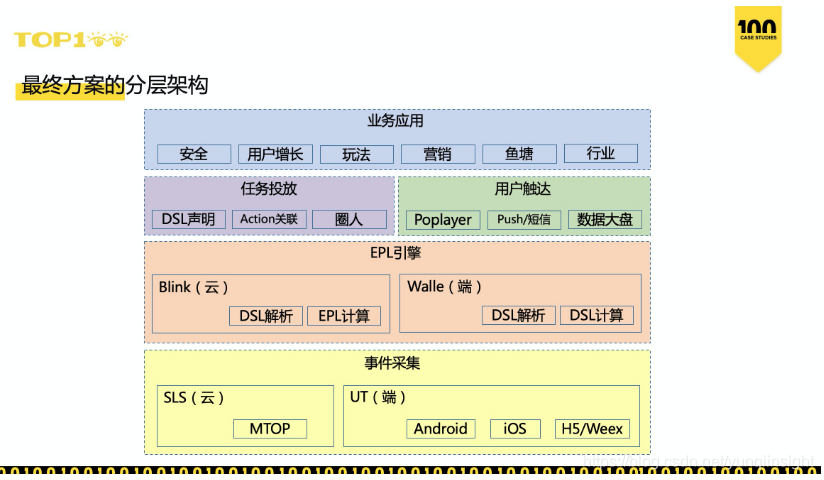 基于这套用EPL(Event Programming Language)写出的DSL,为了做好工程化,我们做了如下的整体分层架构。为了快速实现最小闭环验证效果,我们选择先基于Blink(Blink是阿里对Flink的内部优化和升级)做云上的解析和计算引擎。