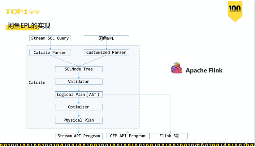 由于我们采取了类SQL语法,而Calcite是业界通用的解析SQL的工具,因此我们采用Calcite并通过自定义其中的parser来解析。如果是单一事件的DSL,则会解析成Flink SQL。如果是多事件的DSL,则会解析后通过直接调用Blink的API接口的方式来实现。