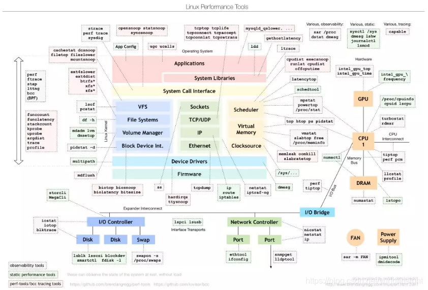 首选,我们来看一下大名鼎鼎的「性能工具(Linux Performance Tools-full)图」,想必很多工程师都知道,它出自系统性能专家 Brendan Gregg。该图从 Linux 内核的各个子系统出发,列出了我们在对各个子系统进行性能分析时,可使用的工具,涵盖了监测、分析、调优等性能优化的方方面面。除了这张全景图之外,Brendan Gregg 还单独提供了基准测试工具(Linux Performance Benchmark Tools)图、性能监测工具(Linux Performance Observability Tools)图等,更详细的内容请参考 Brendan Gregg 的网站说明。