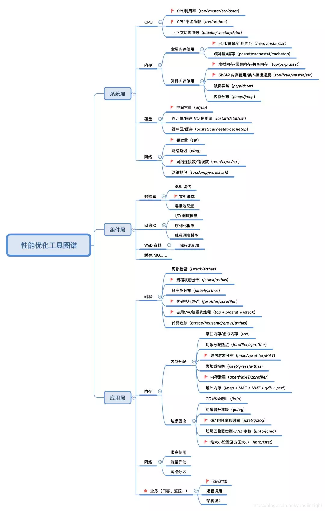 对比上面的性能工具(Linux Performance Tools-full)图,下图的优势在于:把具体的工具同性能指标结合了起来,同时从不同的层次去描述了性能瓶颈点的分布,实用性和可操作性更强一些。系统层的工具分为CPU、内存、磁盘(含文件系统)、网络四个部分,工具集同性能工具(Linux Performance Tools-full)图中的工具基本一致。组件层和应用层中的工具构成为:JDK 提供的一些工具 + Trace 工具 + dump 分析工具 + Profiling 工具等。