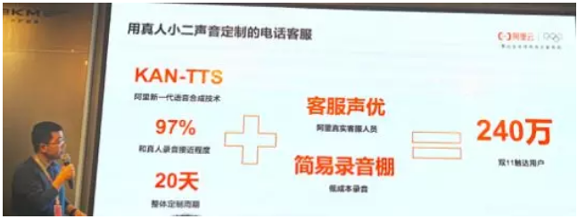 这是基于阿里巴巴真实客服人员的声音定制的电话客服AI,基于今年发布的新一代语音合成技术——KAN-TTS技术,这个技术可以使语音合成的效果,和真人录音的接近程度达到97%。阿里通过技术可以把整个定制周期压缩到20天,录音周期就2天左右,这有效减轻了人工客服的负担。
