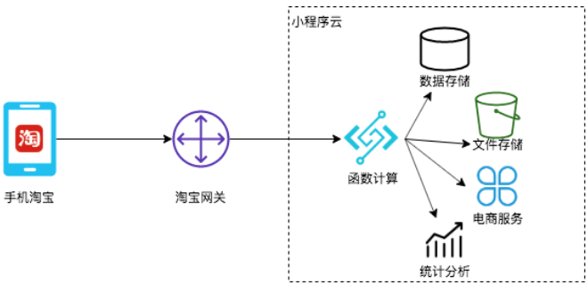 - 函数调用先经过淘宝接入网关,进行必要的鉴权认证,然后调用到小程序云