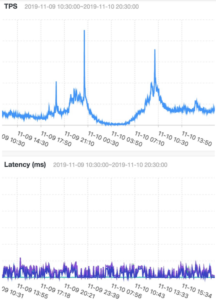 上面是某个淘宝小程序的调用量和延时监控数据。可以看到,在整点活动时,TPS出现了瞬间的高峰,但是P95延时却没有明显的波动。这是因为函数计算在请求高峰来临时,能够快速地弹性伸缩创建新的实例,同时利用已有资源做一定的缓冲,使得整个攀升的过程能够比较平滑。