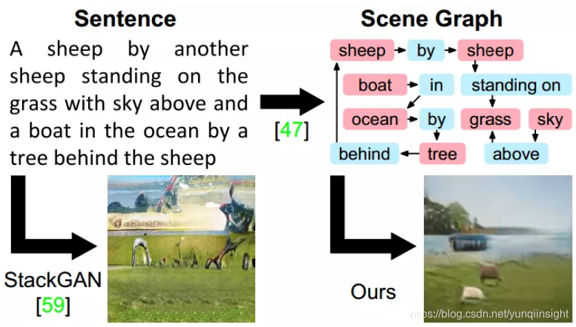 我们将焦点移至文本生成图像(text-to-image synthesis)领域。此领域中,针对简单单一主体的图像生成,例如:鸟、花、人脸等,利用GAN的思想而来的一系列算法已经取得了一些令人欣喜的结果,如图1。然而,当文本中含有多个相互关联的物体时,生成的效果就会大打折扣,如下左图所示。这主要是由过于灵活、非结构化文本所造成的。
