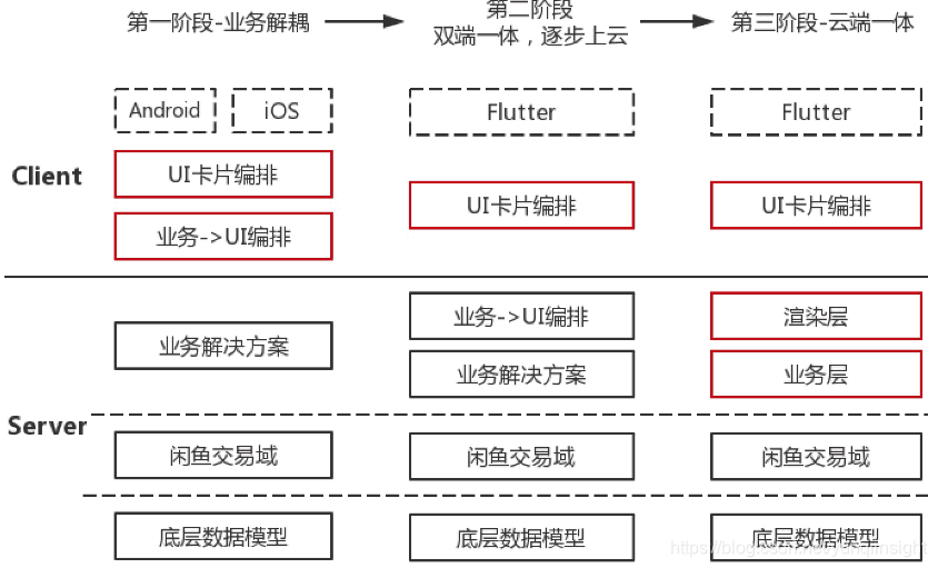 此时,服务端仍分为3层:底层数据模型、闲鱼C2X交易域、业务层。业务层包含业务解决方案、页面渲染解析。客户端上仅保留渲染层。