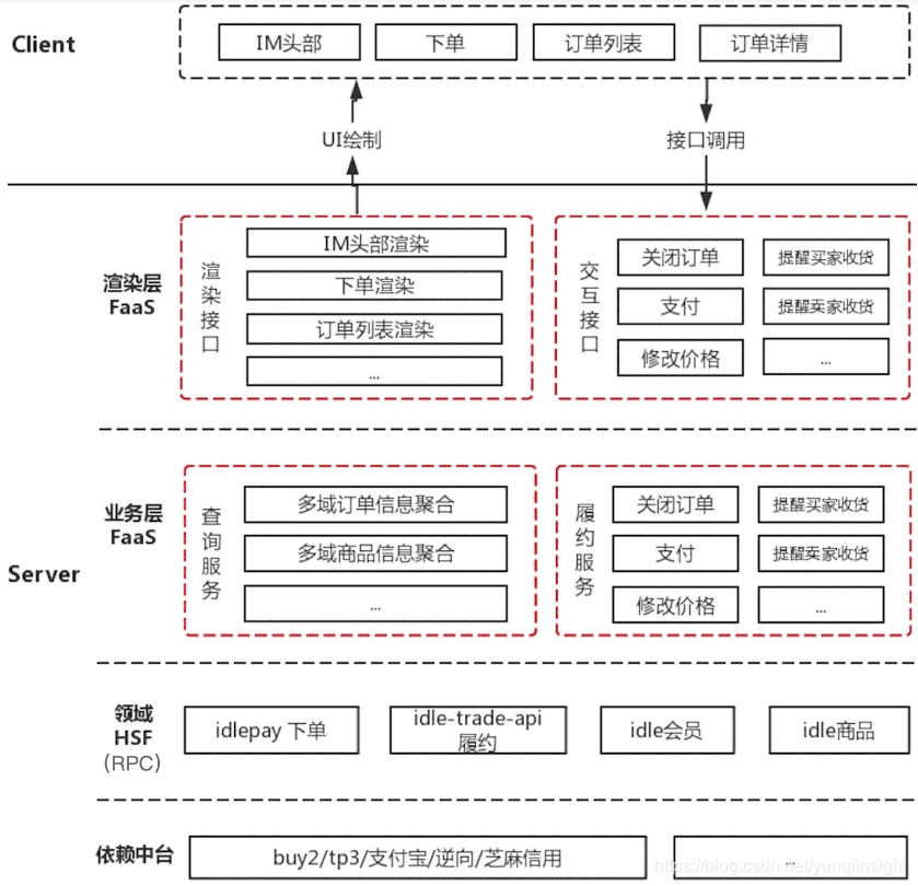 在云端一体的研发模式中,Server进行了重新的分层,后端能够专注领域建设,客户端开发完成原有的业务解决方案以及到渲染协议的解析,即下图标红部分。当然,在实际开发过程中,FaaS与领域的边界因实际业务有一定交集。