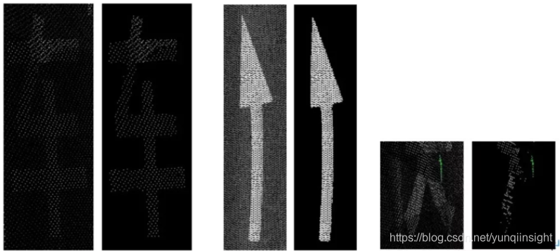 地面标识识别需要做的是将地面标识这部分区域提取出来,则最直观的是对其进行阈值分割、骨架提取、连通域分析等传统方法。首先获取点云中地面点集合,接着获取集合中高反射率部分的骨架集合,然后对每个局部骨架区域计算强度截断阈值,最后对区域进行连通区域搜索以及附加降噪措施等。