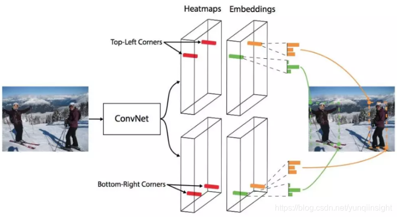 此种方法简化了网络的输出,通过将目标检测为成对关键点,消除了现有的检测器设计中对特征层需要大量anchors的弊端,因为大量anchors造成了大量的重叠以及正负样本不均衡。同时为了产生更紧密的边界框,网络还预测偏移以精细调整角点的位置。通过预测热力图、嵌入向量、以及偏移最终得到了精确的边界框。