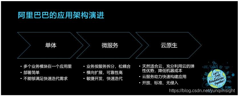 这个时候,阿里巴巴就在往云原生的方向去迈进,而且通过整个云服务能够更快地加快整个阿里巴巴的技术构建。而且云原生架构,是一个比较开放、标准、没有侵入性的技术架构。
