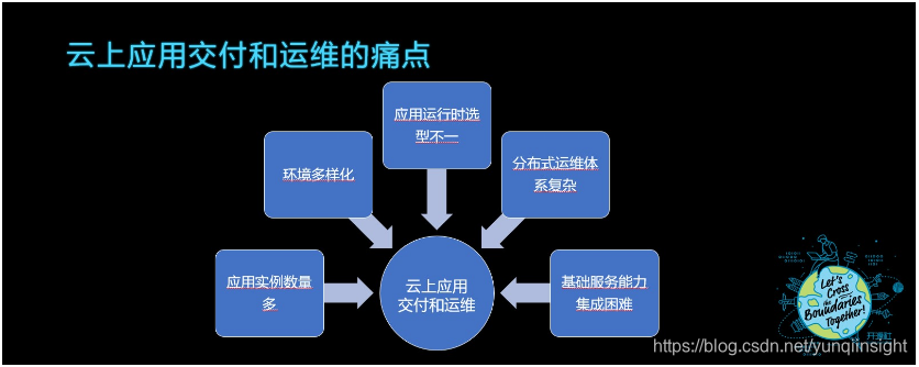当这些应用已经放到云上去运行的时候,由于很多的云服务并没有被标准化,很多这种云的能力需要集成到应用上的时候,也会有很大集成的困难。而这些云上应用运维的痛点以前也有类似的,我们可以跟过往的解决方案做一个对比。