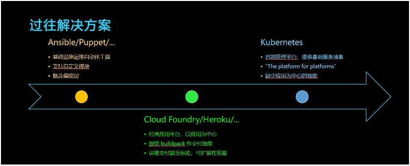 随着 Docker 容器的横空出世,打破了传统基于 buildpack 的应用交付模式,所以就出现了新一代的容器管理平台,而 Kubernetes 成为了云原生时代一个新的容器平台事实标准。Kubernetes 本身提供了很多基础服务抽象,比如说 Deployment、Service。在社区里面它有一句很著名的定位:“Kubernetes is the platform for platforms.”也就是说,Kubernetes 定位是构建平台的平台,能够简化构建应用平台的复杂度,它不会再去做上层基于应用的抽象。大家可以发现历史总是那么相似,从过去的运维工具到后来基于应用的抽象,到现在容器出现打破运维格局,重新对这个领域进行洗牌,自然,在云原生时代需要一个对应交付和运维应用的平台。