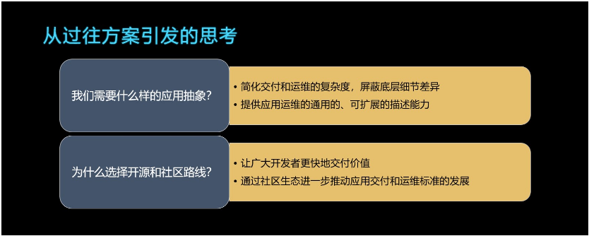 首先,它需要解决我们运维交付的一个复杂度,以及屏蔽底层细节差异。无论什么时候,都是应用平台需要解决的问题。另外,参考我们过去比较传统的应用平台的问题,比如说 buildpack 这种方式,它存在不通用/不易于扩展的问题,我们认为接下来的应用抽象,它应该要具备在应用运维方面更加通用、可扩展的描述能力。