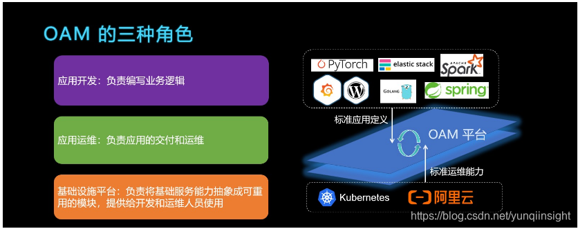 - 首先是应用开发。很明显,应用开发是负责编写业务逻辑的。比如说它会写 Spark、Wordpress、Spring Cloud 等微服务的程序,它写完这个微服务的程序之后呢,会按照 OAM 标准编写一段应用定义;
