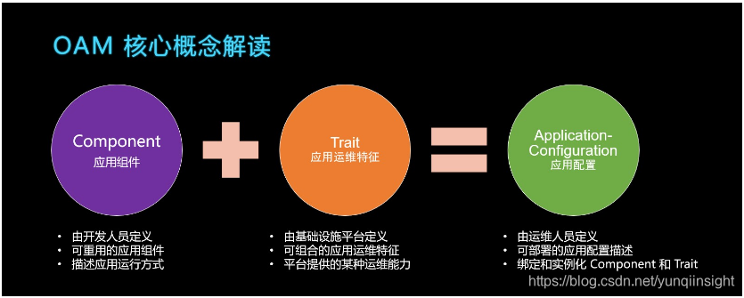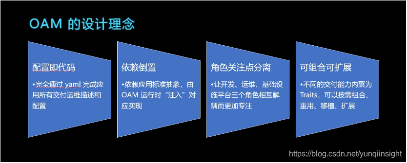 - 第四个就是整个 OAM 的设计是一个可组合可扩展的方式。它会通过让我们刚刚说到的 Traits 能够按需组合、重用、移植和扩展。