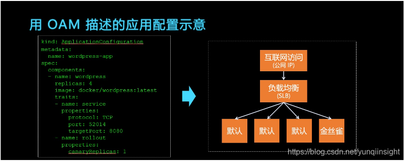由运维人员编写的 ApplicationConfiquration 文件,它将 Component 和 Trait 两个概念绑定在一起。首先里面描述运维要部署一个叫 wordpress-app的应用,它引用了一个叫 wordpress 的 Component。这是开发人员在另一个配置文件 Component 定义的,他除了定义 wordpress 应如何运行(比如配置镜像位置)以外,还允许运维配置运行实例的副本数以及运行时环境变量 test-key 的值。在 ApplicationConfiquration 里同时引用了两个运维特征,运维人员会填写这个应用需要一个负载均衡,要做外网的端口映射,部署时需要采用金丝雀发布策略。这个文件对应到实际上的部署阶段会变成如上图右侧所示,上面会有一个负载均衡,比如在云上运行时,就会使用 SLB 去做负载均衡的自动分发,会给它配置外网 IP 和内外端口映射。