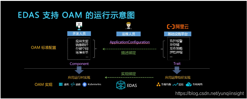 EDAS 作为 OAM 的运行时,在读取到这份部署配置后,它会去实现 Trait 提供相应的运维特征动作,比如说运维描述需要一个块存储,那么 EDAS 会在阿里云上面去申请一个具体的块存储对象,并绑定到这个应用上面。同时 EDAS 会提供一个容器环境(如 Kubernetes)去运行开发者定义的 Component 的工作负载,比如购买 ECS,配置好容器环境,把环境变量传给容器,使 Component 能够正常运行。
