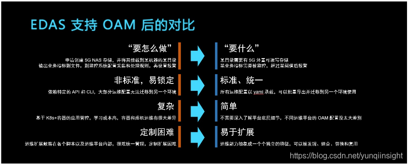 在没有使用 OAM 的时候,客户需要和系统解释我要做些什么事情、我要怎么做这个事情。比如说,他需要申请 5G NAS 存储,并且要把它挂载到某个机器的某个目录上面;或者他还有一个监控的需求,他需要告诉系统现在有一个业务指标文件,需要被监控采集,他要去设置这个文件的指标处理规则,最后把这个指标存储成时间序列数据,并且设置报警阈值。在使用 OAM 之后,它就变成了描述式,他只要描述我需要什么东西就够了。比如开发者可以说这个目录上面需要有 5G 的外置可读写存储就够了,具体这 5G 存储怎么申请是由 OAM 运行时去帮助解决的。另外,在监控的时候,他只需要描述自己的这个应用需要被监控、哪个指标需要被监控并报警就够了,他不需要了解对接到具体是哪一个监控系统,他不需要去关心这些事情。
