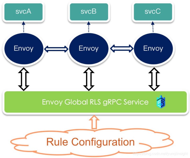 上面的示例配置了两条规则,针对的 domain 都是 foo(与 Envoy 的配置相对应),其中一条规则会对所有目标为 service_aliyun 集群的请求进行控制,QPS 最大为 1;另一条规则控制所有来源 IP 为 30.40.50.60 的请求每秒不超过 10 次。
