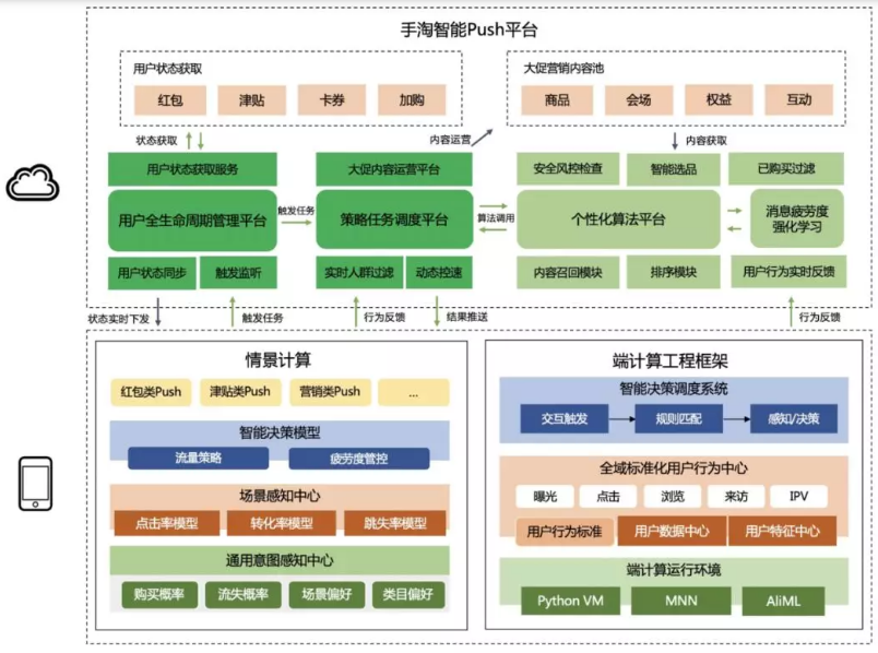 建立了全域标准化用户行为中心,使得手淘可以在第一时间感知用户的实时行为,并且在端上直接加工成为标准化的特征。依赖于端侧机器学习推理框架,我们在端上部署了智能意图预测系统,通过情景计算框架可以准确实时感知用户的场景需求和预测各种购买意图,将这些场景需求和购买意图输入到端上的智能决策模块后,由决策模块决定是否向云端发起对用户的消息提醒和触达,实现亿级用户的全域秒级精准触达能力。