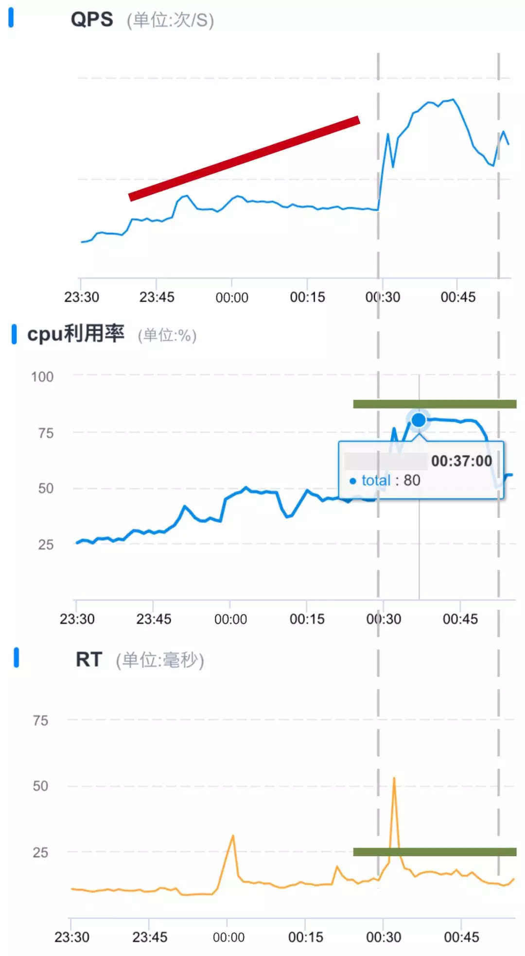 自适应限流控制效果:在流量飙升/大流量压力时,CPU稳定控制在阈值,且服务RT正常