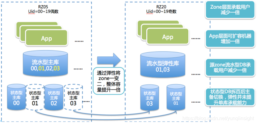 过去架构下的DB扩展,由于DB单机存在极限,且一个UID最多对应一台机器,所以这里的扩展能力是通过DB新增集群,应用加数据源来实现的。这就会带来一系列的问题,比如应用的内存增长、多数据源导致弹出弹回费时费力、多个DB集群的日常维护成本高等。为解决这个问题,考虑让DB也能像应用一样可以动态扩容,且必须突破一个UID最多一台机器的限制,从而能达到应用和DB同步扩容,不用增加新DB集群就能达到新的容量支撑能力。