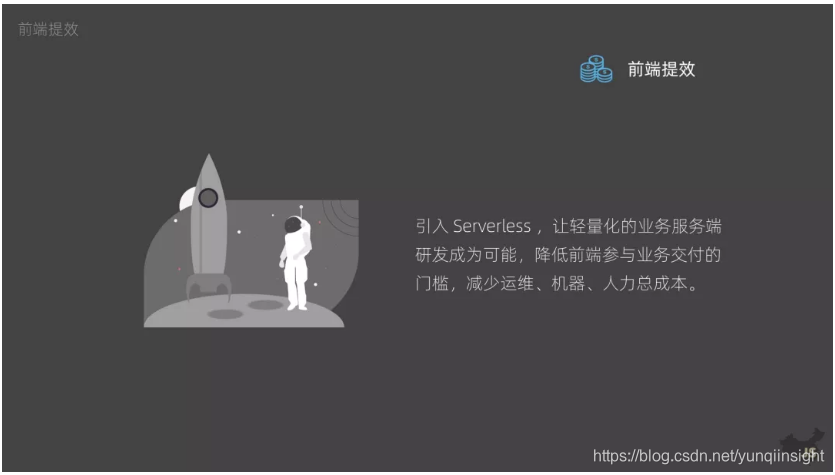 而“前端提效”,则是希望让 Serverless,用更轻量化的方式进行业务研发,降低整个前端参与业务交付的门槛,同时,在开发期间,也能减少人力总成本,让前端减负,业务小步快跑成为可能。